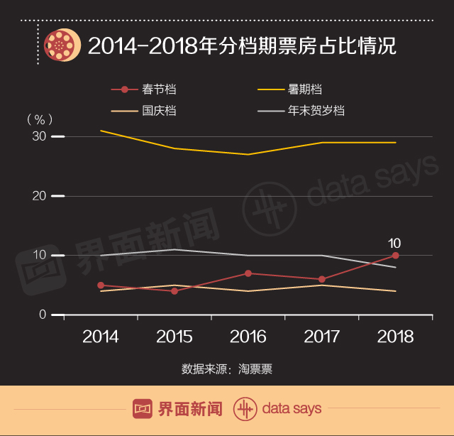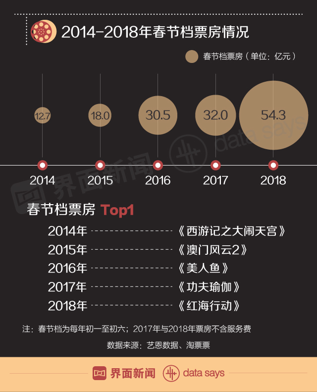 据艺恩数据,2018年春节档票房共计54.3亿元,创新高。同时,近5年来,春节档电影票房在全年总票房中的占比逐年提升,2018年占比达10%。