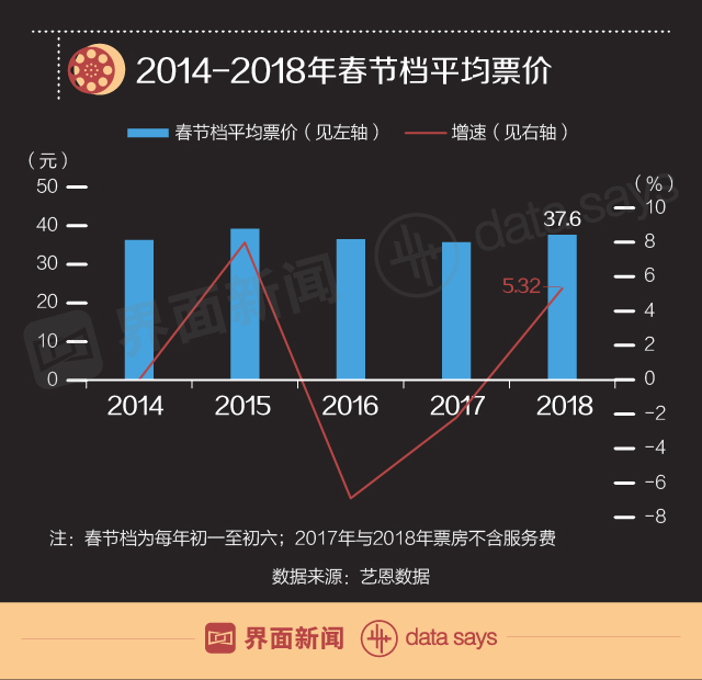 从单张票价情况来看,2018年春节档单张影片平均售价37.6元,高于近两年水平。同时,2018年春节档平均票价增速为5.32%,比2017年高出7.51个百分点。