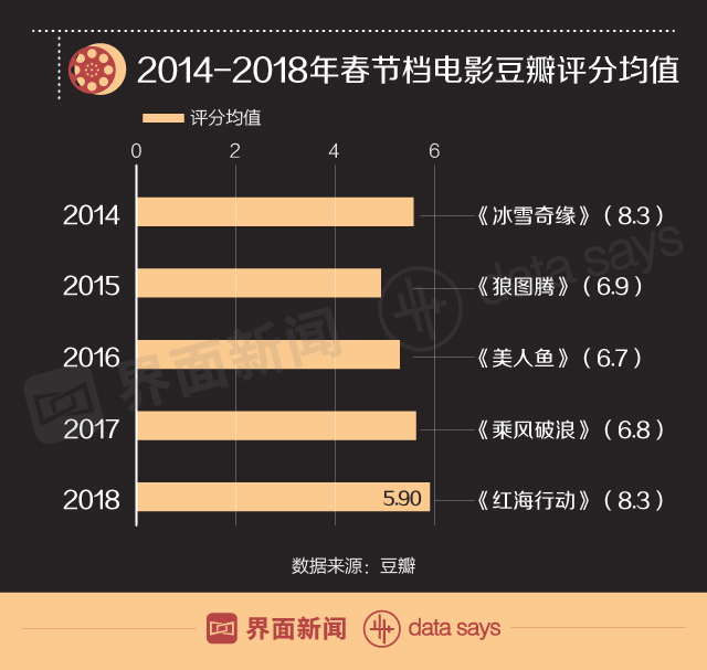 春节档口碑如何?豆瓣数据显示,近年,春节档电影评分均值逐年抬升,2018年接近6分。其中,头部电影《红海行动》豆瓣评分达8.3。