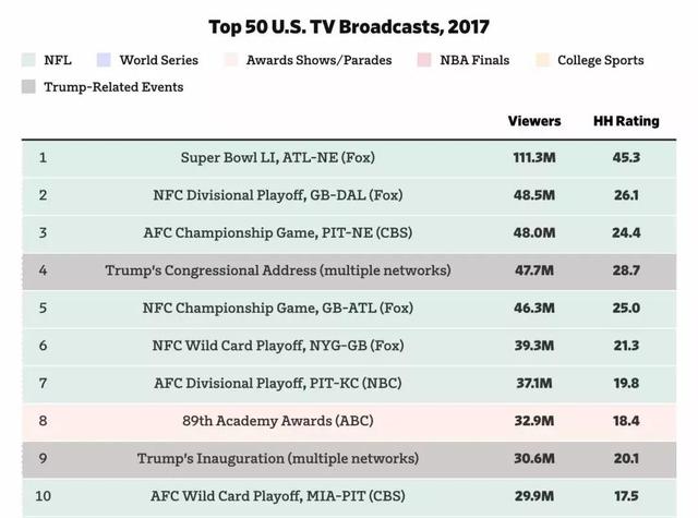 超级碗在美国的收视率超过一亿人,是绝对的收视巨无霸。除了这场比赛,没有任何电视节目的收视率可以到达5000万人。去年收视率的第二名和第三名,也都还是NFL美联和国联的分区决赛,收视率在4000万左右。