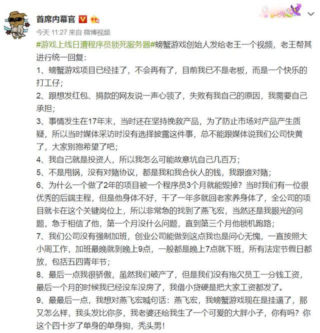 尹柏霖还表示,燕飞宏失踪当天把社交媒体的签名改成了“大吉大利,螃蟹挂X”,最后还要求螃蟹网把他的公积金交上,再次回到公司。最后公司的员工集体反对,没有通过。