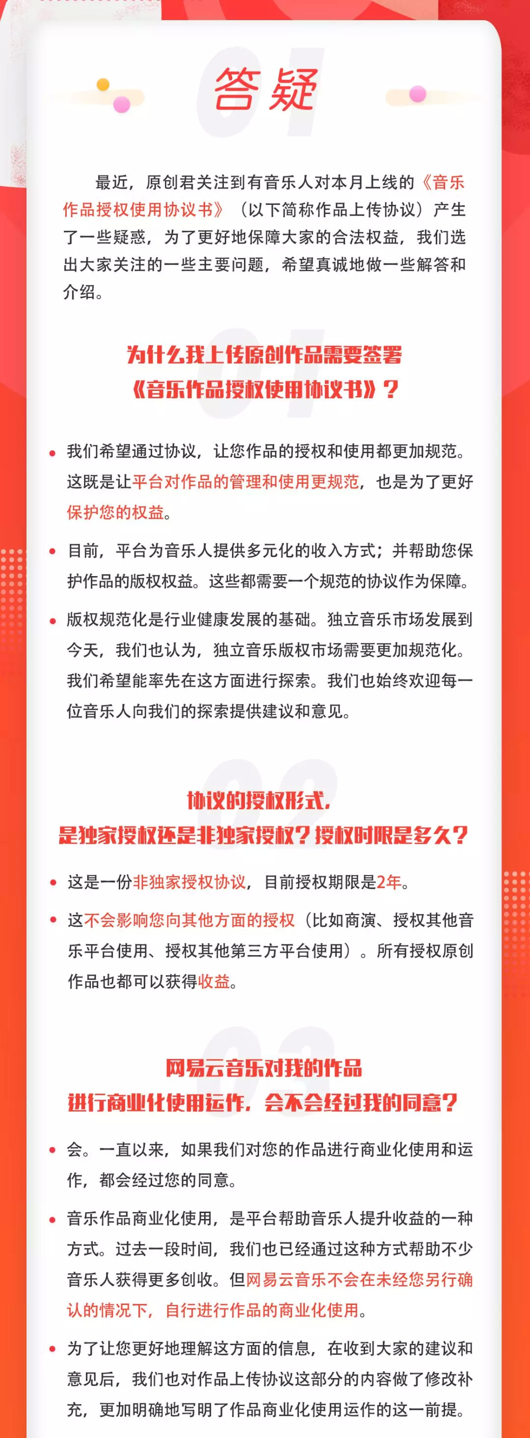 那么,事情真相到底如何?对此读娱君联系到网易云音乐,其表示,最近更新的《音乐作品授权使用协议书》只是为了规范平台对音乐作品的管理和使用。该协议为非独家授权,目前授权期两年,且不会影响音乐人其他方面的授权。此外,网易云音乐表示,不会在音乐人未经另行确认的情况下,自行进行作品的商业化使用。