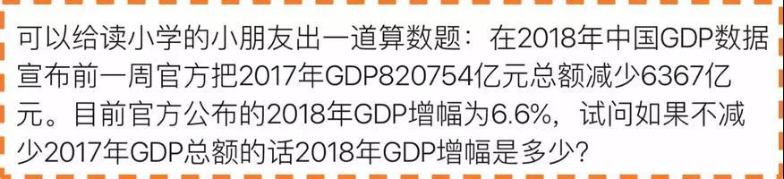 由于调低2017年GDP就在公布2018年GDP数据的三天之前,有观点认为调低2017年GDP是为了拉高2018年GDP增速,有人还给“读小学的小朋友”出了一道数学题(见下图)。