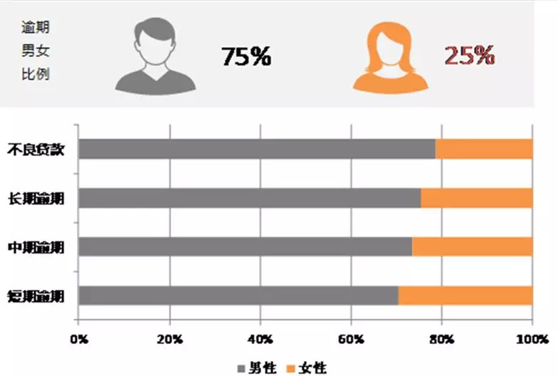从男女比例上看,总体上有信贷逾期历史的人群中男女比例约为7.5: 2.5,与申请贷款人群的男女比例基本持平,但是从逾期的严重程度上来看,男性比女性更易发生严重逾期行为。