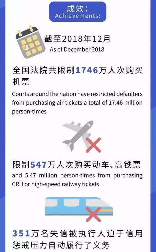 数据显示,从2013年10月至2018年12月31日,全国法院累计限制1746万人次购买机票,限制547万人次购买动车、高铁票。