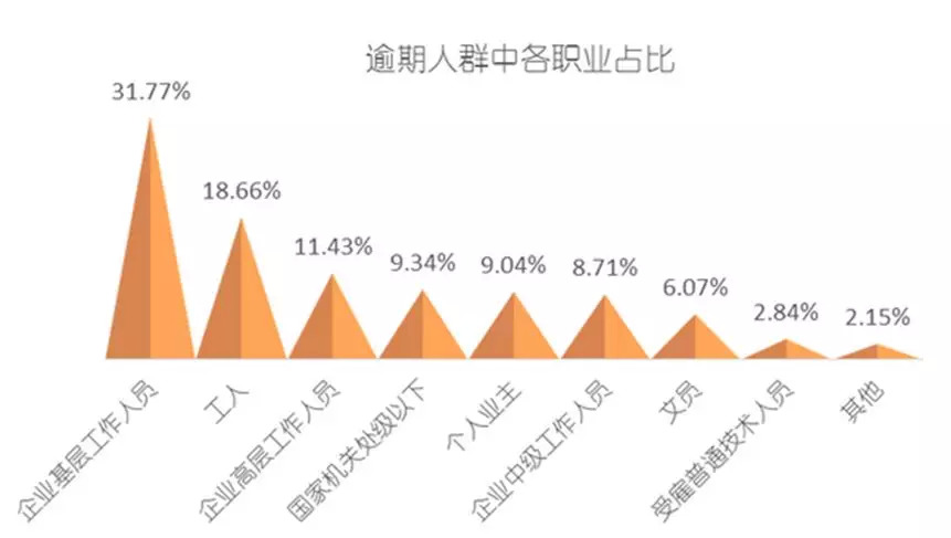 在逾期人群总体中,企业基层工作人员的占比也是最高的,达到30%以上,这类人群收入较低,但对金钱的需求量较大,并且工作性质相对不稳定。
