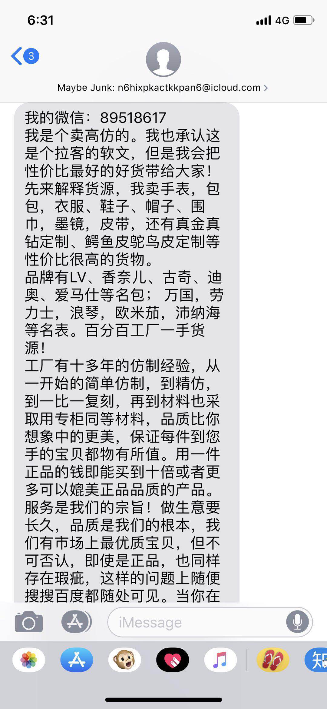 一方面,售假者会随机添加微信好友发私信,或者群发写得情真意切的垃圾短信,撒网式地触及潜在客户。另一面,他们会在Instagram、抖音这样的平台,通过购买广告,让潜力客户看到他们发的产品图片或是视频。