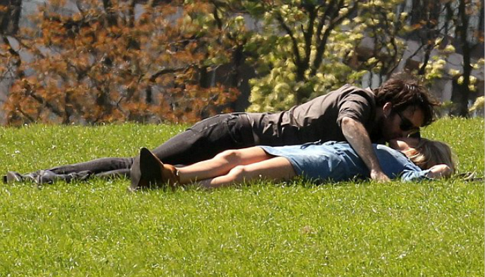 之后,这对情侣在公园内悠闲散步,劳拉紧靠在丹尼肩上,两人享受着惬意的阳光。