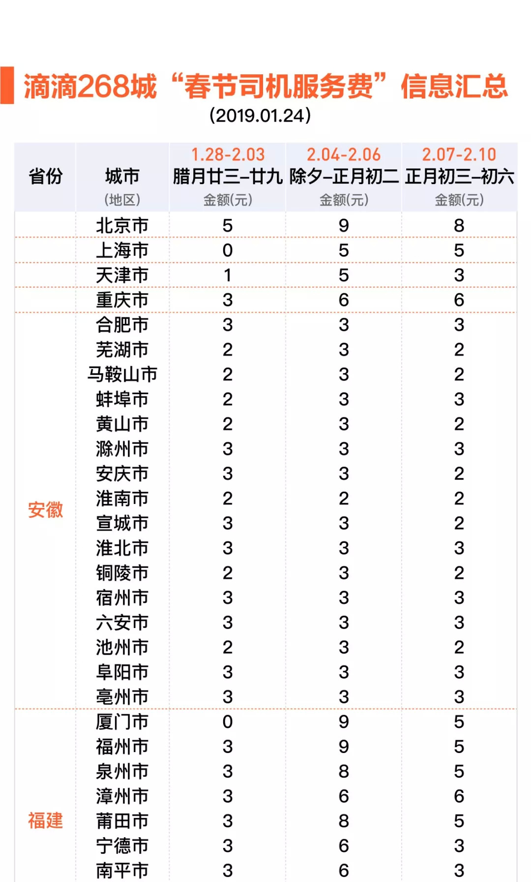 根据滴滴公布的信息,北京、三亚、武汉、南昌在除夕至初六期间需要支付的司机服务费均超过8元,是金额最高的四个城市,其他城市集中在3-6元,其中上海在春节期间的司机服务费为5元。