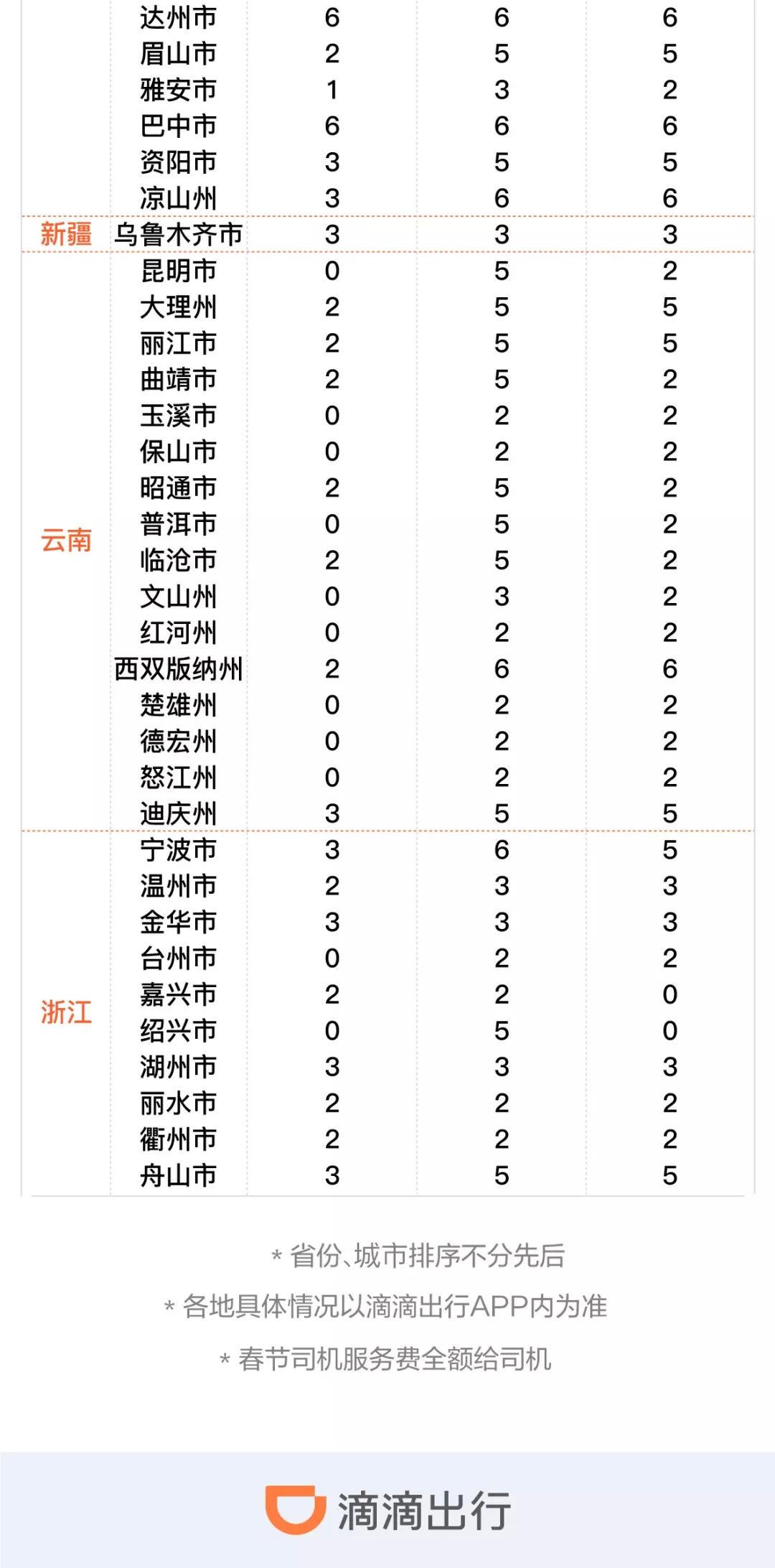 为了鼓励以及补偿司机在春节期间接单,滴滴继续延续了去年春节期间的实行的“司机服务费”。腊月廿三至正月初六期间,乘客使用滴滴打车需额外支付司机春节服务费,根据地域不同从1元到9元不等,服务费将全额给到司机,滴滴不抽成。去年春节期间,司机服务费最高5元。