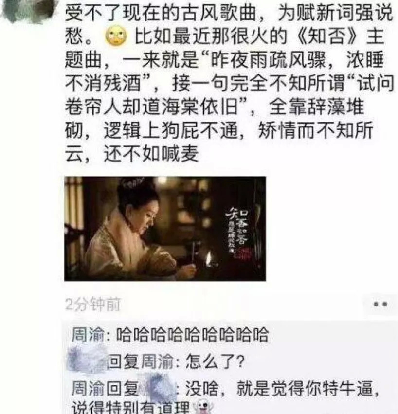 近年来传统文化复兴,本来是好事。但浑水摸鱼或走火入魔者也很不少。就在孙楠送女儿学“女德”的新闻闹得沸沸扬扬这两天,还有另一个网络段子广为流传:网友批评《知否》歌词词藻堆砌,逻辑不通。
