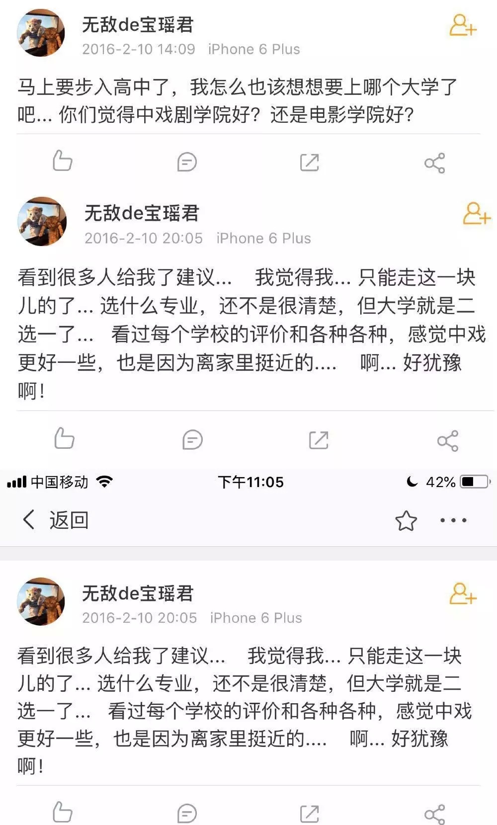 2016年的时候,买宝瑶还在微博和大家讨论,应该选什么大学上什么专业。热爱表演的她,表示心仪中戏和北电。不得不感慨潘蔚的心思之狠,城府之深:离开北京,就脱离了买宝瑶熟悉的同学和亲人;学习国学,就磨灭了她表演的兴趣。