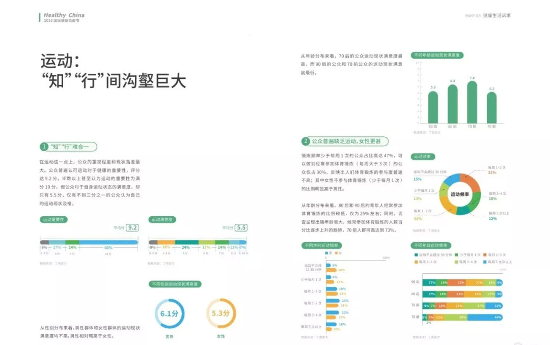 《2019国民健康洞察报告》显示, 公众普遍认可运动对于健康重要性的评分达9.2分,但公众对于自身运动状态的满意度,却只有5.5分,仅有不到三分之一的公众认为自己的运动现状及格。