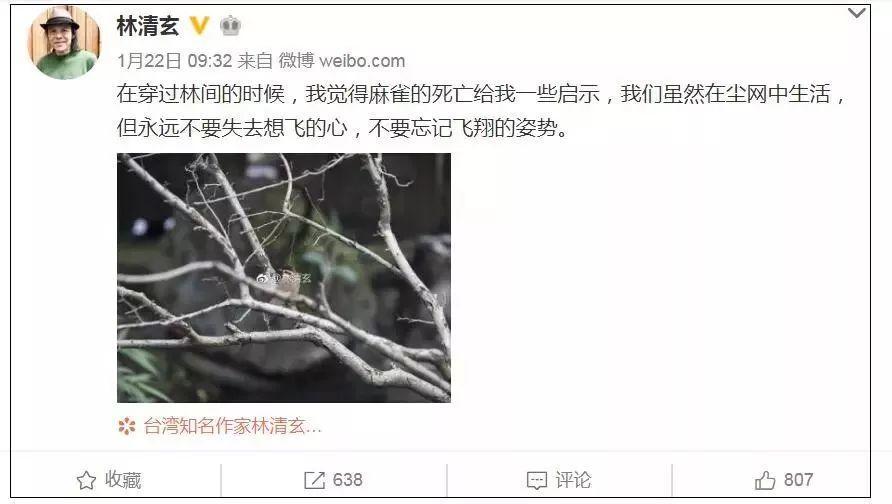 这个消息来得很突然,就在21号,林清玄还发了一条微博畅想自由与飞翔:“在穿过林间的时候,我觉得麻雀的死亡给我一些启示,我们虽然在尘网中生活,但永远不要失去想飞的心,不要忘记飞翔的姿势。”