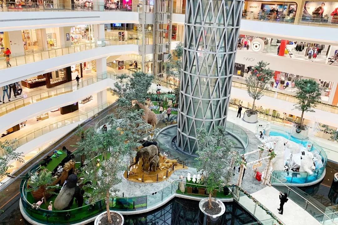 在刚过去不久的圣诞季,这里迎来了“绿洲动物园”,从俯视图看整个场景其实还是搭配得非常得当。“绿洲”,把动物园和中庭的名称都涵盖了进去,商场本身的绿植和动物又能无缝融合,从场景性来看简直不能更好,仅剩的问题在于——只能从“合家欢”理念角度与圣诞季做关联,在形态上少了点圣诞红。