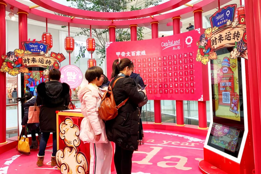 该中庭根据商场三角形主动线主要分为三个区域,此次活动也依此将其分为快闪店、互动区和自拍点三个主区块,职能逻辑清晰。在这一层面,基本的视觉以及互动性方面都已有所体现,再来说说年味。