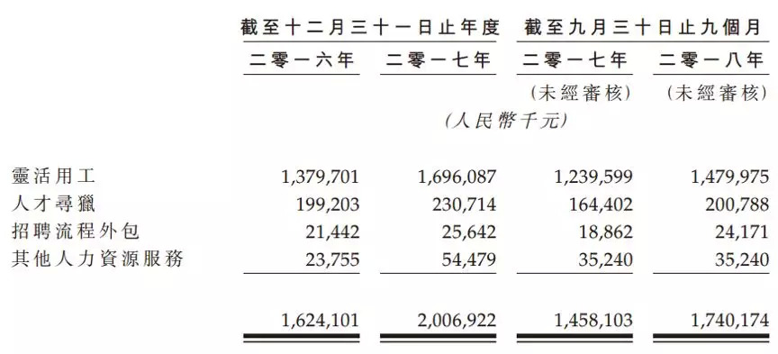 2016年、2017年及2018年前三季度,公司合共为逾2.4万名、2.8万名及2.6万名合约员工介绍职业,主要集中在销售及营销、信息技术及行政管理等行业。