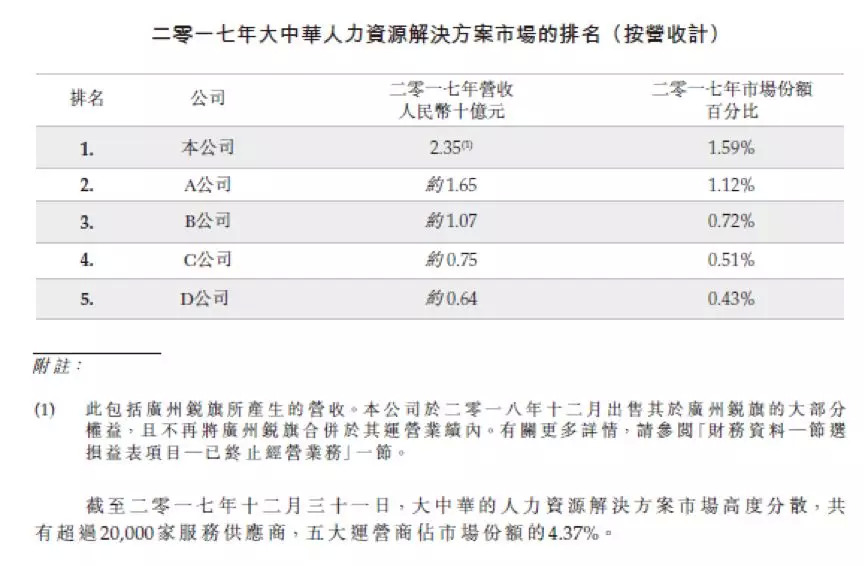 聆讯资料显示,根据灼识咨询的资料,按2017年营收计,公司是大中华区最大的人力资源解决方案供应商。
