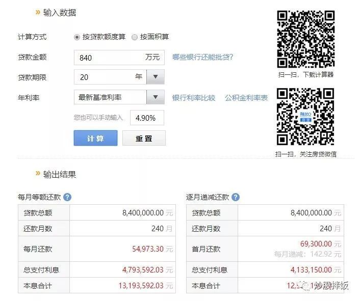 有小伙伴也做了同样的傻事,2017年3月1200万总价买进,现在市价900左右。按照三成首付计算,他需要付出360万本金,840万贷款,随便找个房贷计算器按一下,基准利率20年,月供5.5万,一年要还60多万。