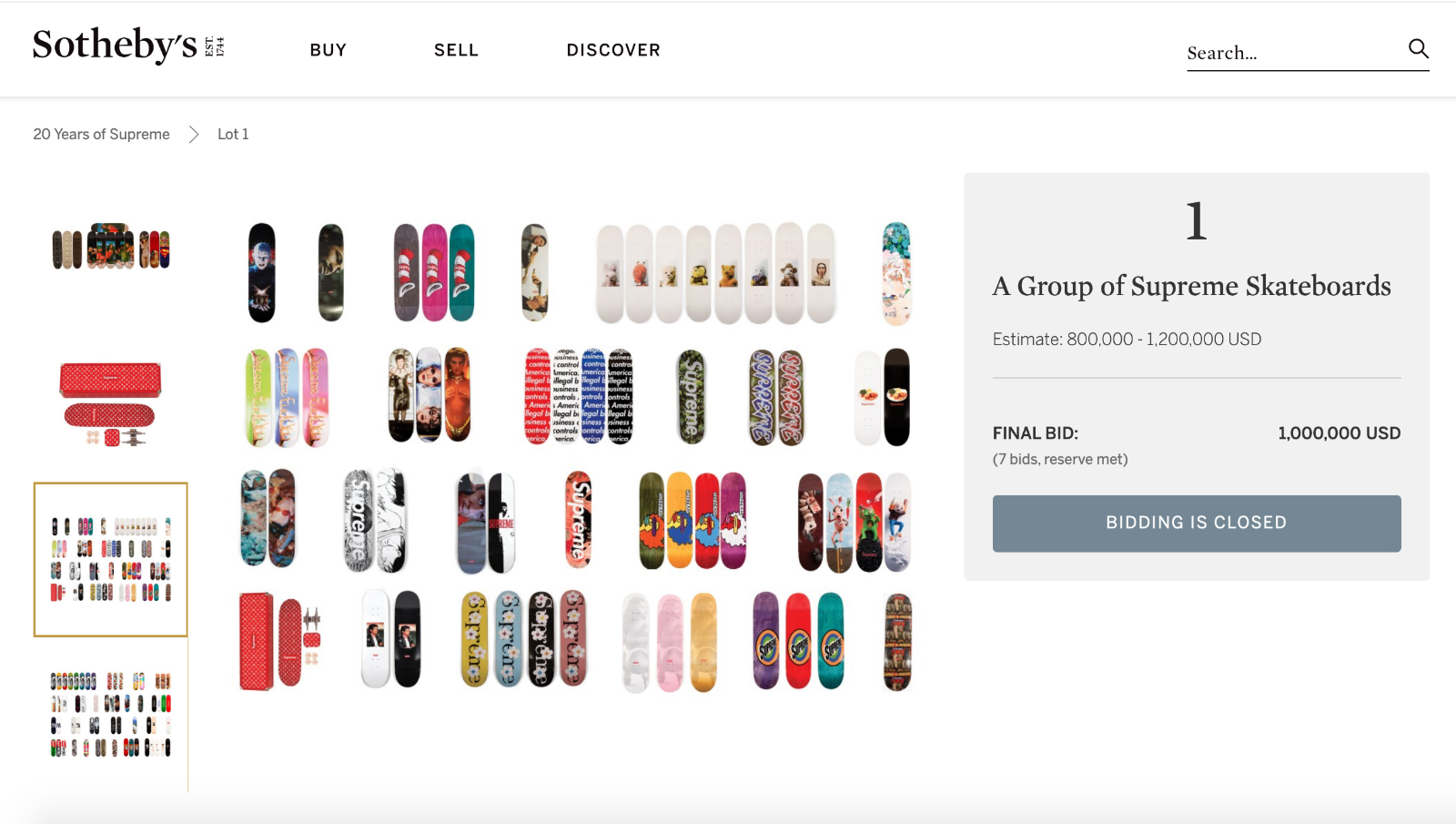 1月26日,这套Supreme滑板被温哥华买家Carson Guo以80万美元(约合人民币540万元)的价格拍下,符合苏富比之前估算的80万-120万美元的成交价区间。而根据潮流媒体Highsnobiety针对这套藏品的报道,潮流物品交易平台Stock X曾给出超过200万美元的估价。