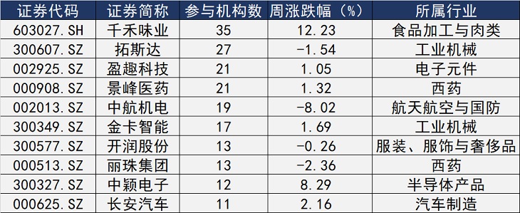 不过,获机构调研的热门企业整体关注度有所上升。Wind数据显示,本周共有14家企业举办的调研会议所吸引的参会机构数量超过10家(含10家),数量较上周略增。这其中,千禾味业(603027.SH)、拓斯达(300607.SZ)、盈趣科技(002925.SZ)和景峰医药(000908.SZ)等四家公司所举办的调研会议吸引了超过20家机构的参与,成为本周热度较高的受调研企业。