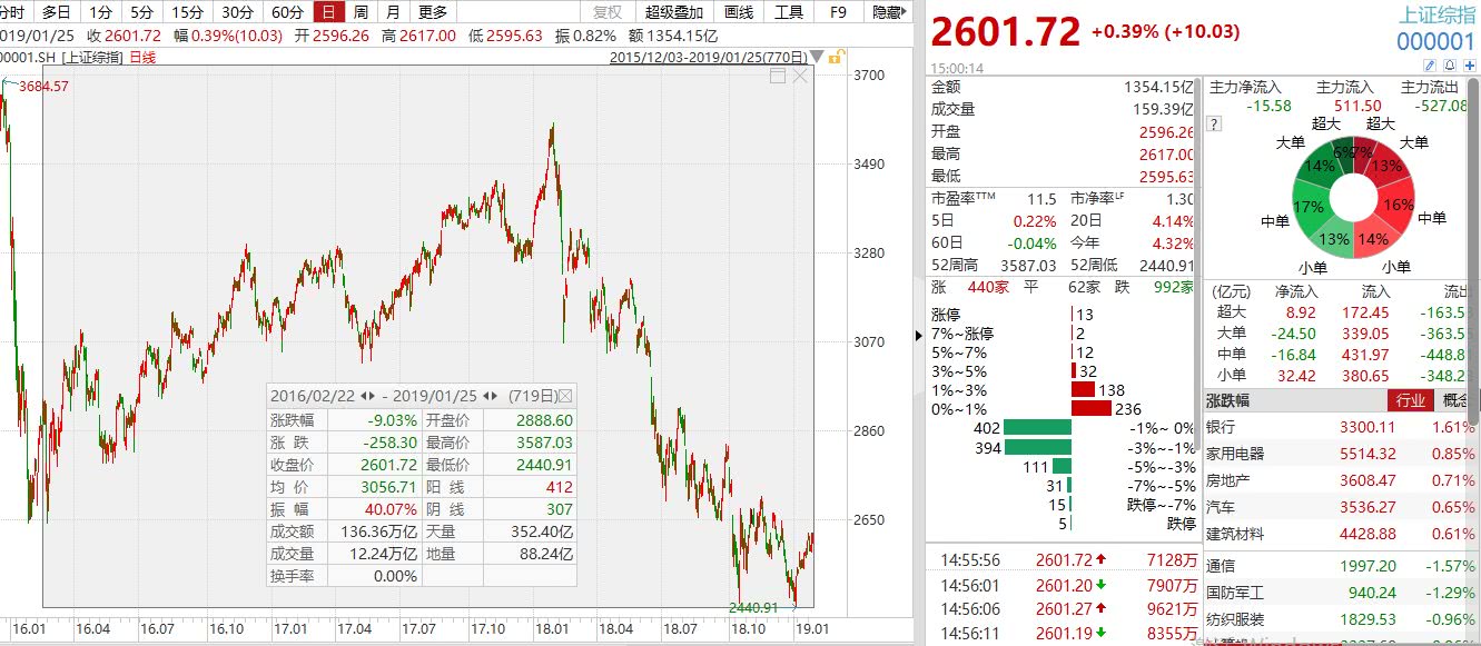 在这3年之中,上证综指经历了一轮过山车行情,股指一度反弹到3600点附近,后又滑向前期低点,并归于沉寂。2019年1月25日,上证综指收报于2601.72点,较刘士余3年前上任之初的2860点,下跌9.03%。