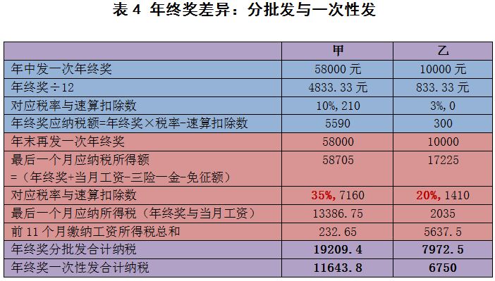 从表4可以看出,在分批发的过程中,由于一年只能采用一次年终奖计税法,故造成另外一次年终奖与当月工资一起发放,造成当月的边际税率飙高,在上例中,甲最后一个月的工资是按65000(下半年的年终奖58000 +基本工资7000)在计税,边际税率升到了35%,而在表3一次性发放的情况中,边际税率仅仅10%。在本案中,年终奖分批发放反而提升了边际税率,加重了税负(其中甲的税负增加了7500元,乙增加了1200元)。有些情况下,当年终奖高、基本工资低时,年终奖分批发可以少交税;但当年终奖低、基本工资高时,年终奖分批发反而大大加重了税负。因此,年终奖分批发并不一定可以少交税。