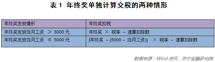 年终一次性奖金扣税方式有下表1中的两种情形,基本逻辑与工资个税缴纳是一致的。年终奖发放当月工资>5000元,交税金额=年终奖×税率-速算扣除数;年终奖发放当月工资≤5000元,在交税之前,年终奖将预先抵扣部分金额,然后以抵扣后的数额作为基数纳税。