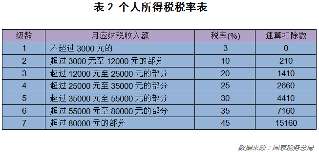 表1中的税率如何确定?基本逻辑是先将年终奖÷12,再将商数与下表2比对,找到对应级数,从而得到对应税率与扣除数,参见表2。