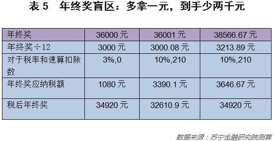 由表5可知,当年终奖为36000元时,若多发一元钱,需多交2300元个税,到手年终奖反而少了近两千元。具体来说,当年终奖为36000元,到手收入为34920元,当年终奖增加至36001-38566.67元时,到手年终奖反而不到34920元。