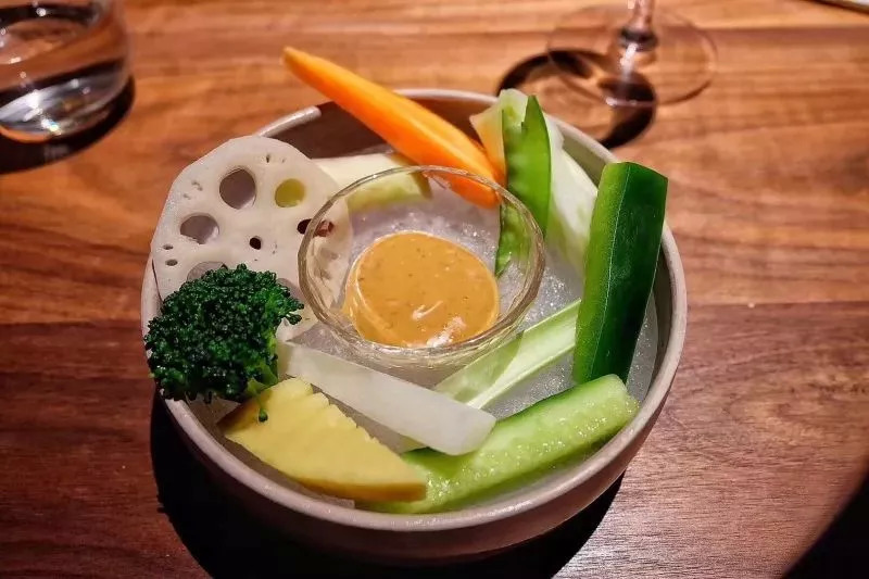 (通常餐厅菜地的头道菜是一排农场的时蔬,胡萝卜、小番茄、小黄瓜、小青菜。这些菜几乎保留了蔬菜整个可食部分。)