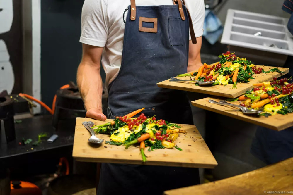 来这里就餐的第一关是爬梯子。因为要到这个屋顶农场,必须通过爬大楼的消防楼梯才能到达。这个看似不便之处反而成了餐厅的亮点之一,因为相比于高等餐厅的红地毯,人们更喜欢这种返祖运动带来的乐趣,更何况爬到楼顶还可以一览哥本哈根的城市风光。