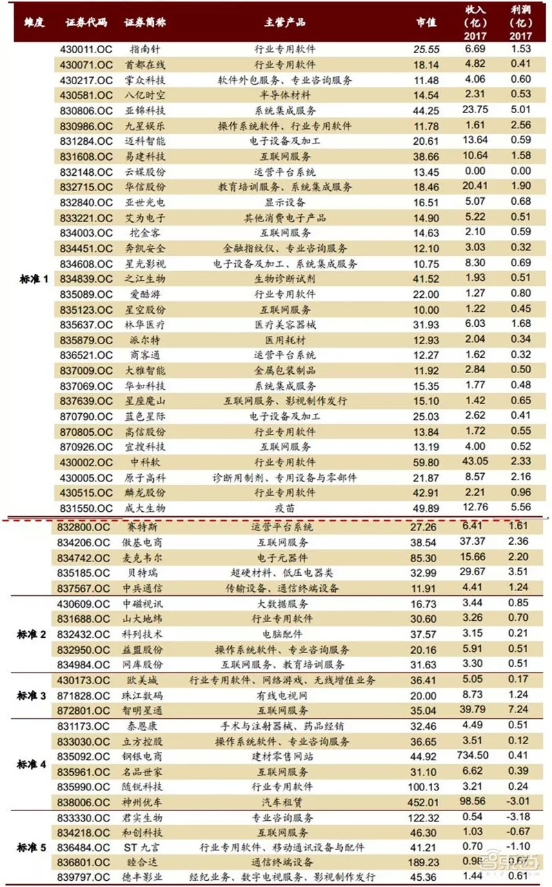 新三板挂牌的 10656 家企业中,符合科创板上市标准的,共有 216 家,剔除传统行业(能源、公共事业、工业、传统材料、日常消费等)和科创板“不欢迎”的行业(金融、房地产),暂不考虑可选消费中的奢侈品、网络游戏、体育、影视、旅行、教育培训等,经销类的公司,还剩下 55 家,其中多个维度的符合上市标准的,均按照市值要求较低的标准来归类,这样满足标准 1-5 的企业分别有 36、 5、 3、 6、 5 家,这些企业的总市值是 2251 亿。