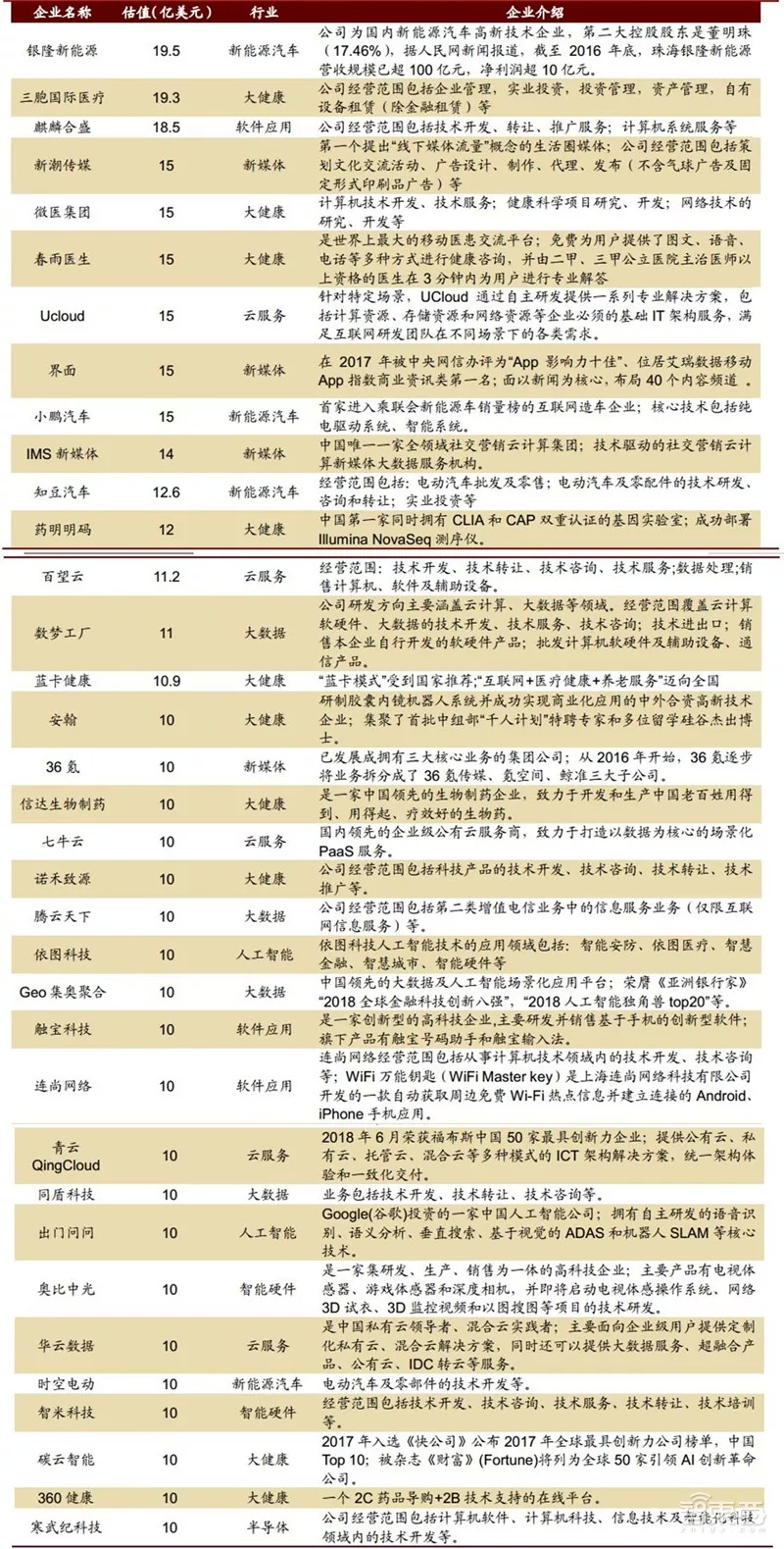 除了这 16 家以外,估值在 10-20 亿美元之间的拥有硬科技如新能源、大健康、大数据、云服务、智能硬件、软件应用等行业的独角兽企业,也有望在科创板上市融资,这 34家企业总估值为 419 亿美元。