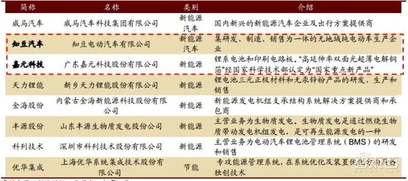 满足最新的推荐指引的第三类新能源及节能环保行业的 8 家企业中,威马企业和知豆企业为新能源整车企业,嘉元科技等五家企业主营为锂电池材料、电池管理系统或生物质发电,优化集成为专攻能源管理系统的节能企业。其中有两家有上市公司持股, 双林股份持有知豆汽车 4.5%的股份, 梅雁吉祥持有嘉元科技(新三板) 20.78%的股份。