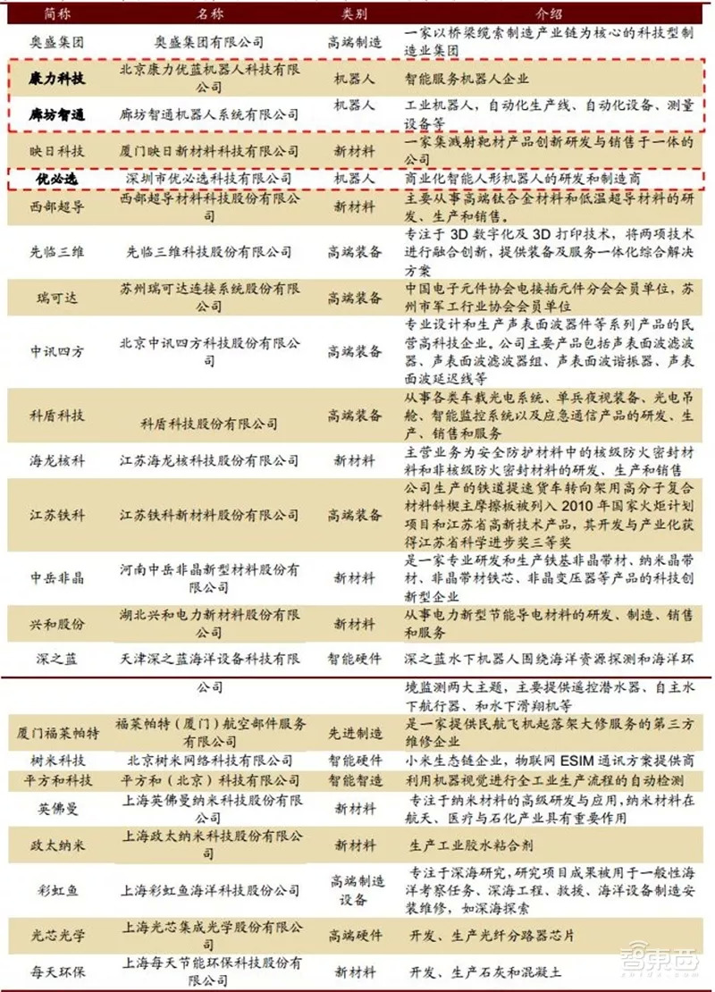 高端装备制造和新材料是券商推荐指引分类中的第二类行业,也是比较符合科创板胃口的“硬科技”行业,我们挑选的 23 家高端制造和新材料、机器人等公司中,有 3 家有上市公司持股。 康力电梯、紫光股份分别持有康力科技 24.63%、 3.42%的股份, 赛象科技持有廊坊智通 25.62%的股份, 科大讯飞持有优必选 0.25%的股份。