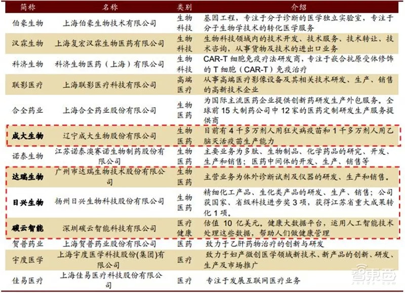 第四类生物医药类的企业主要包括生物技术、生物制药、化学药、医疗器械等,我们挑选了 13 家有望在科创板上市的公司,其中有上市公司持股的有 4 家。 辽宁成大持有成大生物(新三板) 60.54%的股份, 达安基因持有达瑞生物(新三板) 46.33%的股份,海翔药业持有日兴生物(新三板) 16.06%的股份, 中源协和持有碳云智能 1.73%的股份。