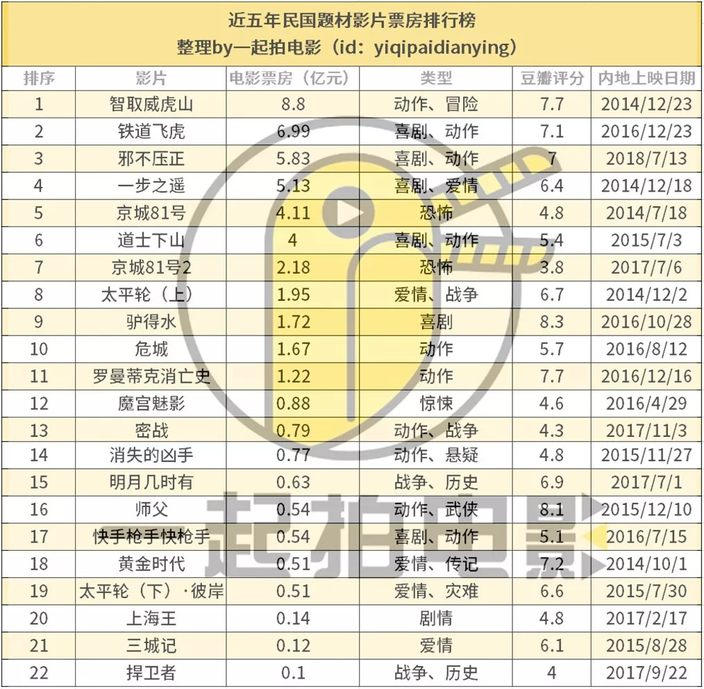 当然,即便是成绩表现较好的《智取威虎山》,故事在时代也有意淡化民国背景,更多地将大量的动作戏放在突出的位置,才保证了影片获得不错的票房成绩。准确地说,这几部都是动作类型大于民国题材的影片。