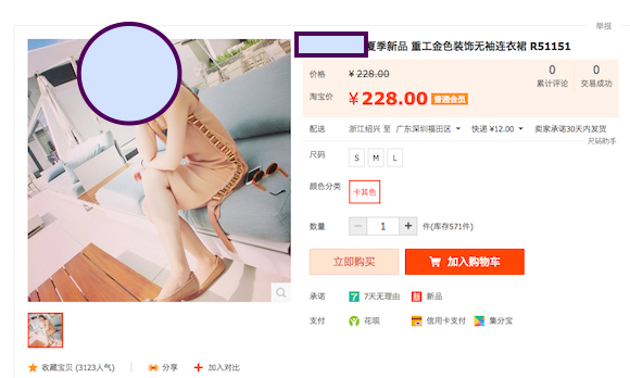 除了手袋,奢侈品牌的成衣在淘宝上同样也有假货。一件原价2.4万人民币左右的Lanvin连衣裙,在淘宝上只需要228元。