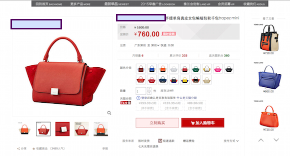 淘宝的假货问题一直受到华尔街和奢侈品牌的诸多诟病。尽管阿里巴巴说的确自己有在操心打假问题,但要在淘宝上买到仿货仍然轻而易举。比如搜索“Celine”,出来的结果中就有下图760元人民币的Celine秋千包。而这款包在法国的售价是1760欧元(约合1.25万人民币)。