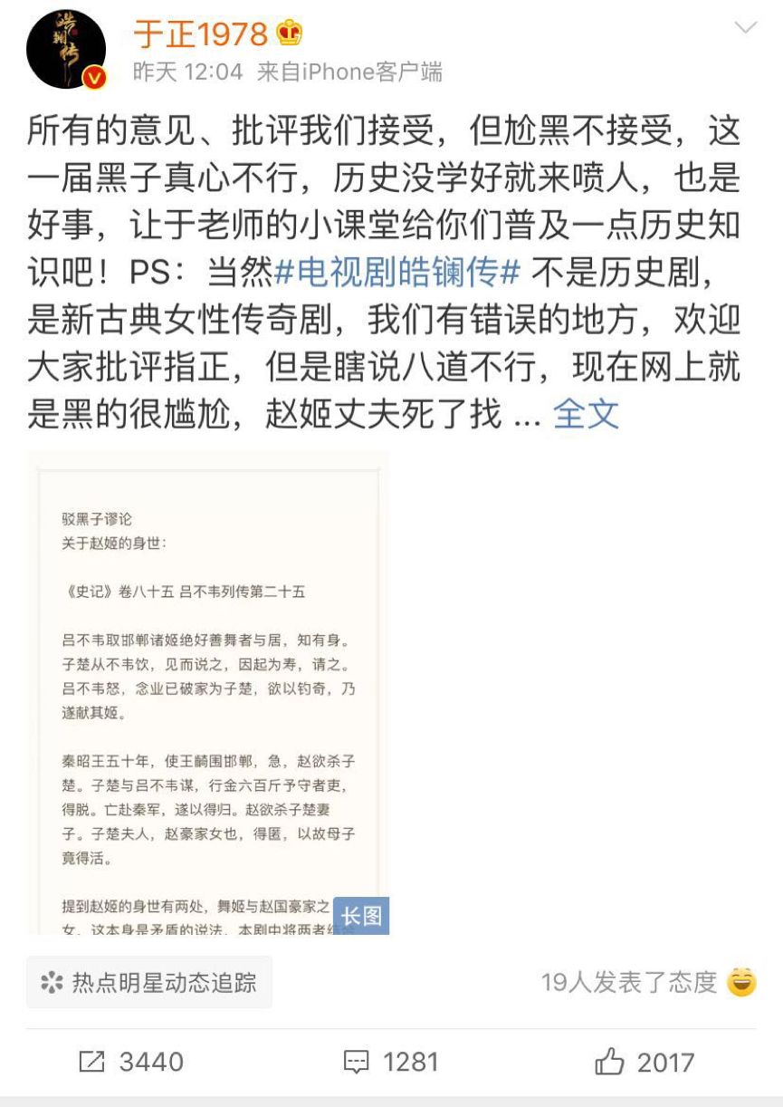 24日晚,于正微博发声,称“不接受网友尬黑”,并表示《皓镧传》是一部新古典女性传奇剧,而非历史剧。至于网友们热议的“赵姬#荡妇”话题,于正也给出了回应,“是在丈夫去世之后的情史”,言下之意,即对赵姬的评价不能用“荡妇”一词。