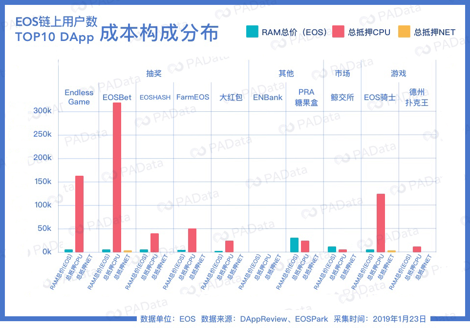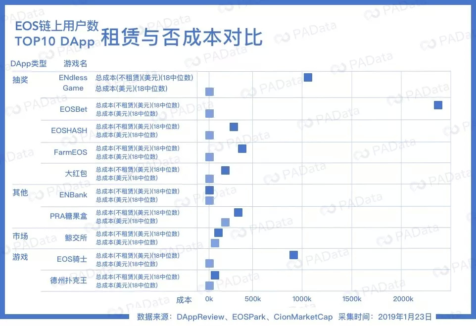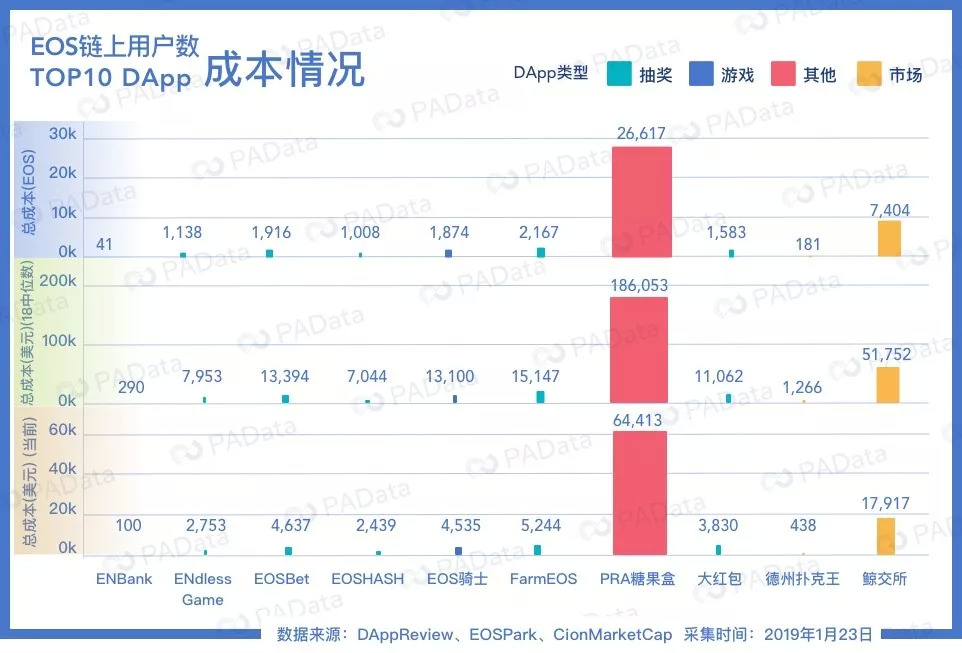 如果以EOS CPU交易市场Chintai上1月23日的收盘价来看,租赁他人1个EOS,需要支付0.05%个EOS的利率,再结合CoinMarketCap上EOS去年全年收盘价的中位数6.99美元的币价来看,虽然PRA糖果盒的成本已经高达18万美元左右,但这比其他大多数DApp的成本高出很多,应该来说,开发一个EOS DApp的成本大概在12000美元左右。
