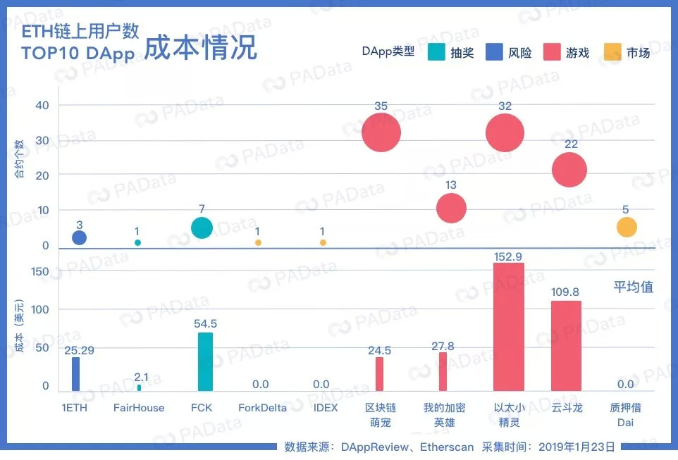 而抽奖类、风险类和市场类(比如交易所、钱包等)的DApp普遍使用方法比较简单,这6个DApp加起来的合约总数都比上游戏类DApp的平均值。开发这些类型的DApp普遍成本较低,最低只需2.1美元即可,最高也只有不到55美元。