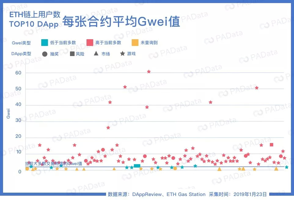 但在统计各个DApp上线合约时设置的Gwei时,PAData发现大部分合约都设置了较高的Gwei值,在总计120个合约中,有89个合约设置的Gwei值都高于当前大多数交易的Gwei值2.1[注2],其中最高的一个合约设置了61个Gwei。大多数开发者都为了让合约尽快上线而付出了较高的Gas price[注3]。