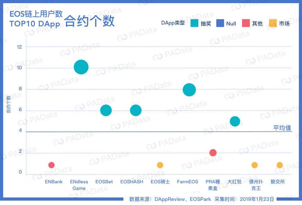 PAData根据DAppReview对EOS DApp的排名,观察了其中用户数量前10的DApp的开发费用后发现,EOS上用户量排名前10的DApp有一半都是抽奖类DApp,这些DApp上线的合约数量也比其他类型多,其中最复杂的一个抽奖DApp是Endless Game,上线了10个合约。而游戏、其他和市场类DApp都只有一两个合约。