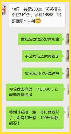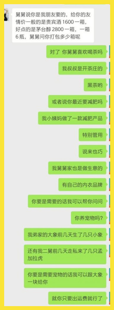人美心善的白富美误加你好友,渐渐和你聊出了感情。某天老家看望爷爷,趁机向你高价出售“爷爷炒的茶”。▼