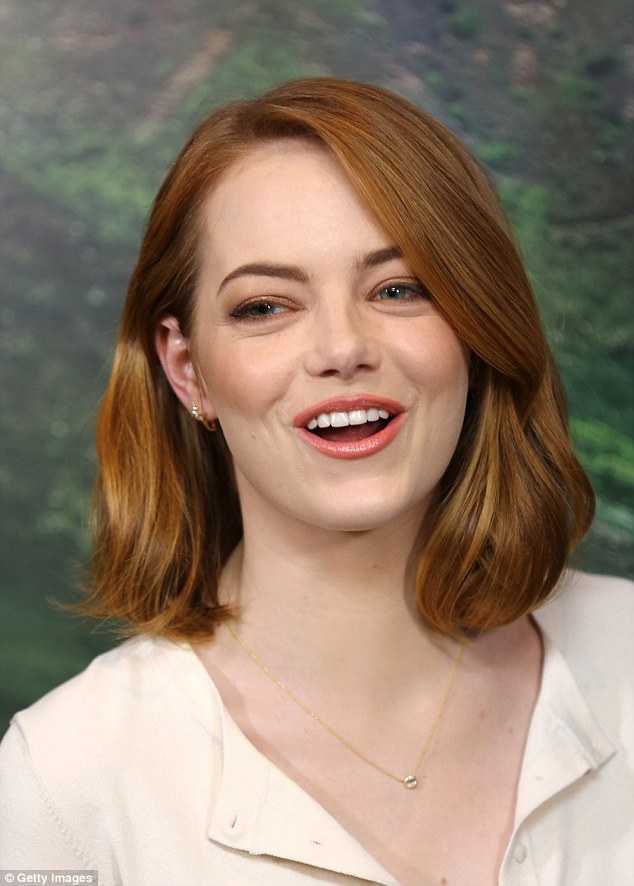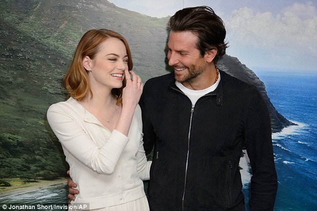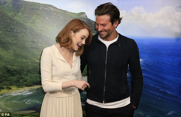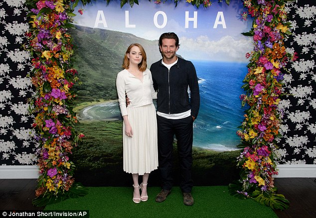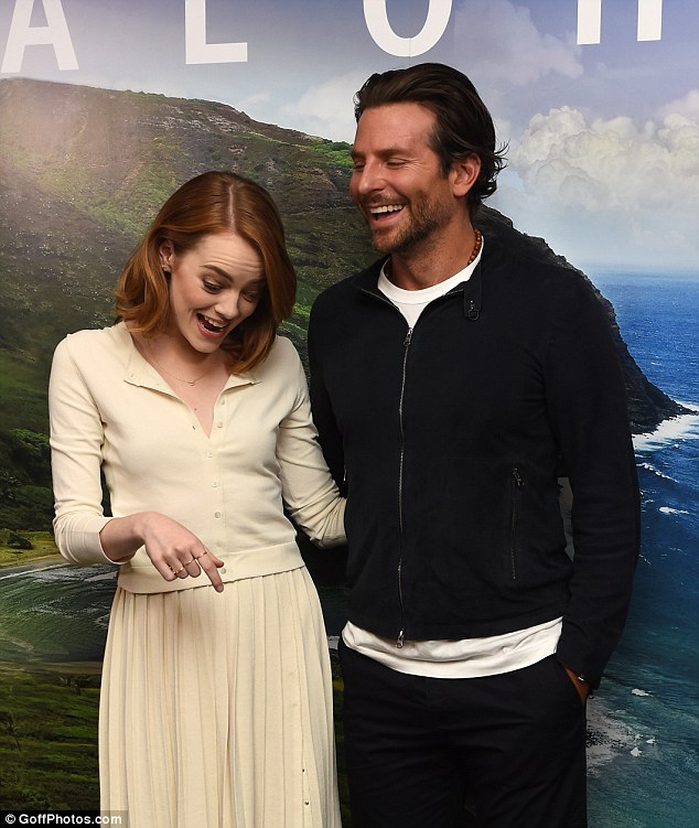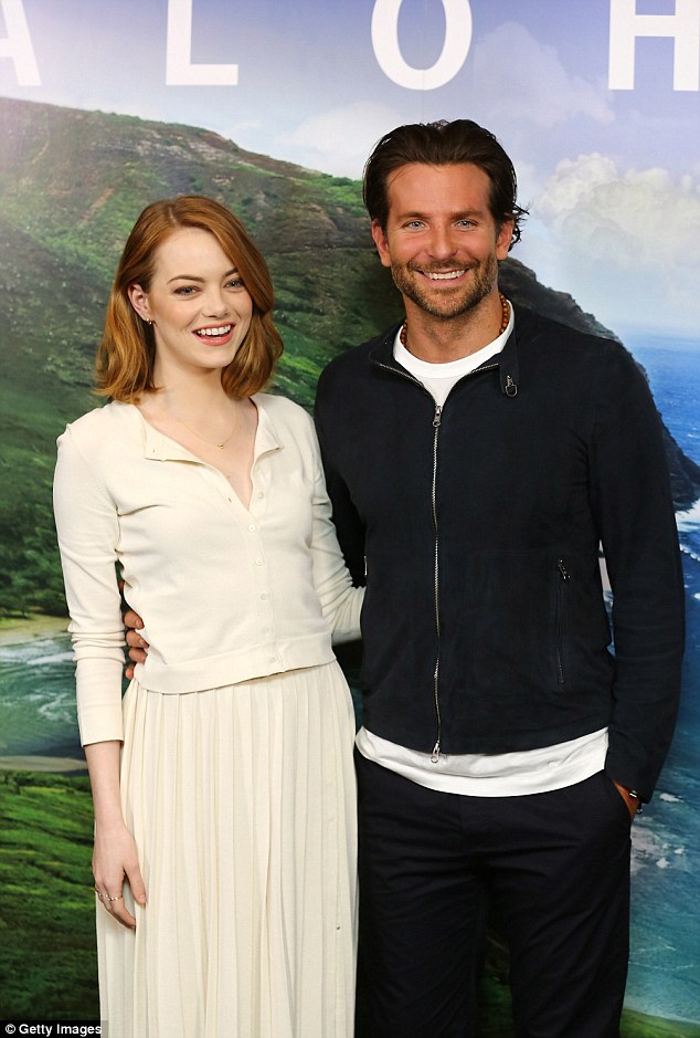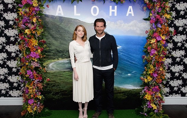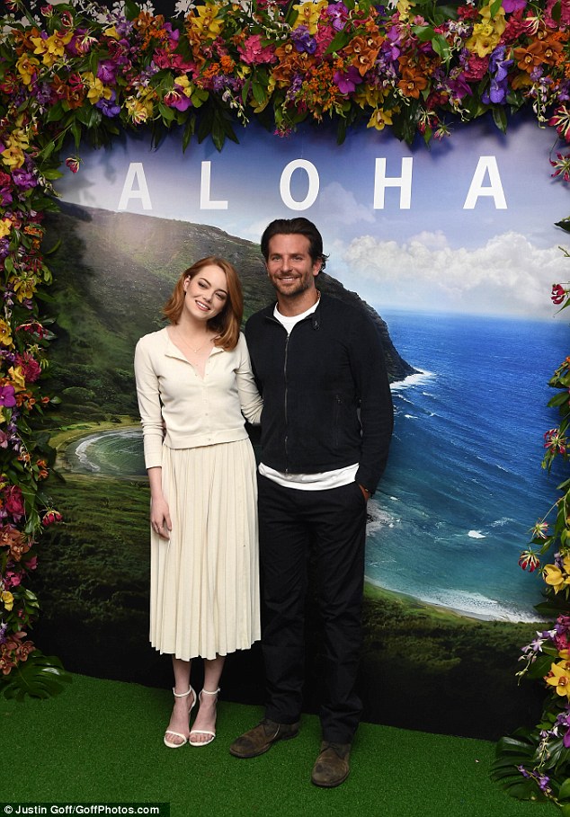 图:鲜嫩如雏菊:爱玛斯通与男主演布拉德利库珀一起出席新片《阿罗哈》周六在伦敦举行的预映活动。