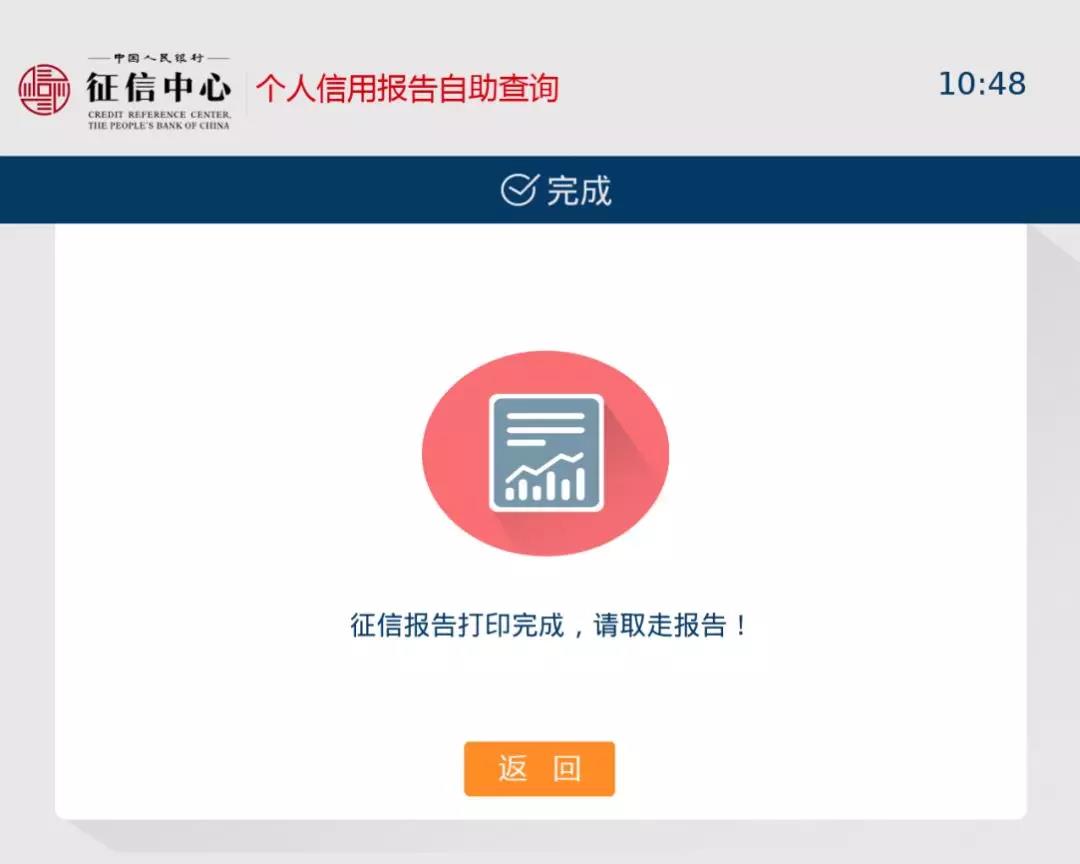 报告打印完成后,系统将提醒用户取走报告,并收好身份证。点击【返回】按钮,报告打印完成。