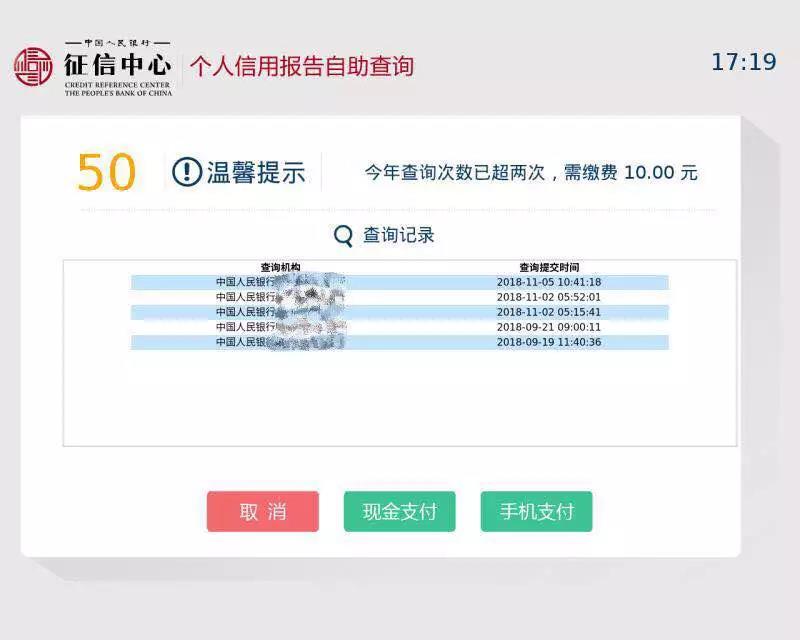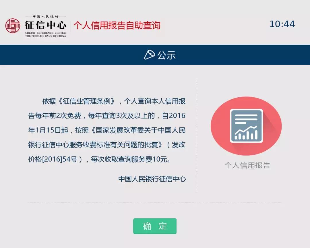 公告指出,个人查询本人信用报告,每年前两次查询免费,第三次及以上查询,每笔支付查询费10元。
