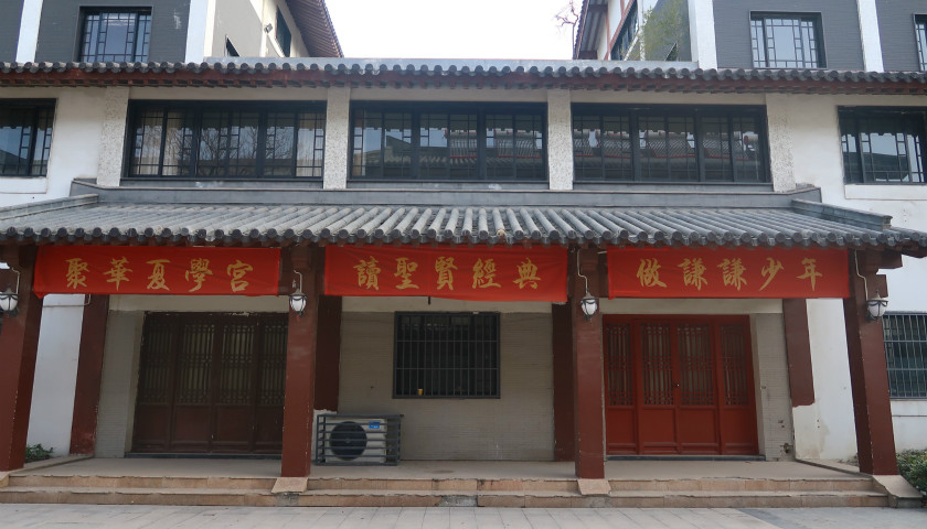 教学区位于学校东西两侧,教学楼的木门两侧多贴有“读经典以通大化,诵诗书以达礼乐”的对联,红底黑字,分外夺目。